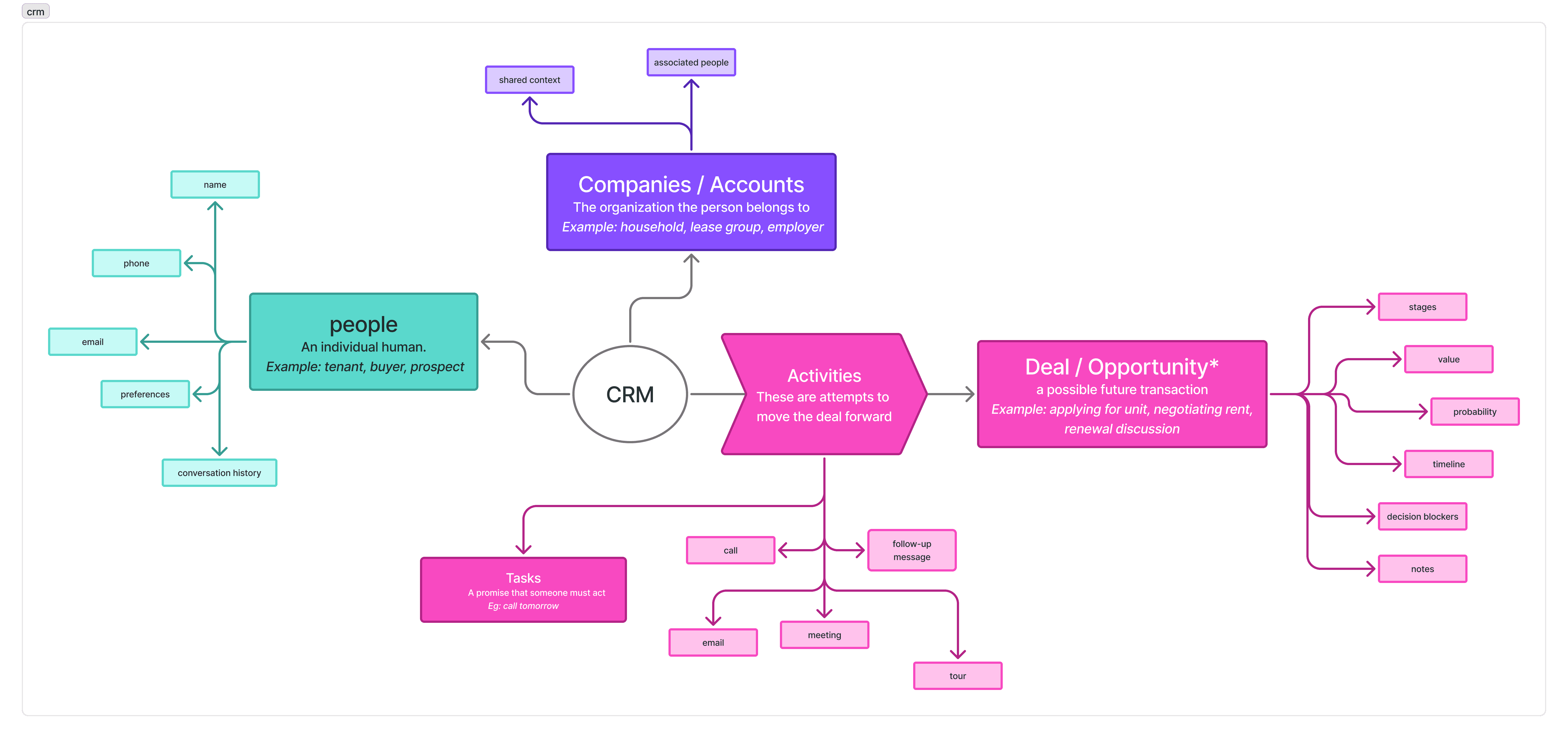 Progress happens through conversations, tours, questions about pricing, negotiation, document exchange, and renewal discussions. Each interaction changes confidence, risk, and intent long before a deal is marked won or lost. Most of this context lives outside the CRM: calls, meetings, WhatsApp messages, emails, and property visits. The following flow illustrates how leasing actually progresses: relationships evolve through interactions, signals accumulate over time, and decisions emerge from context rather than stages.