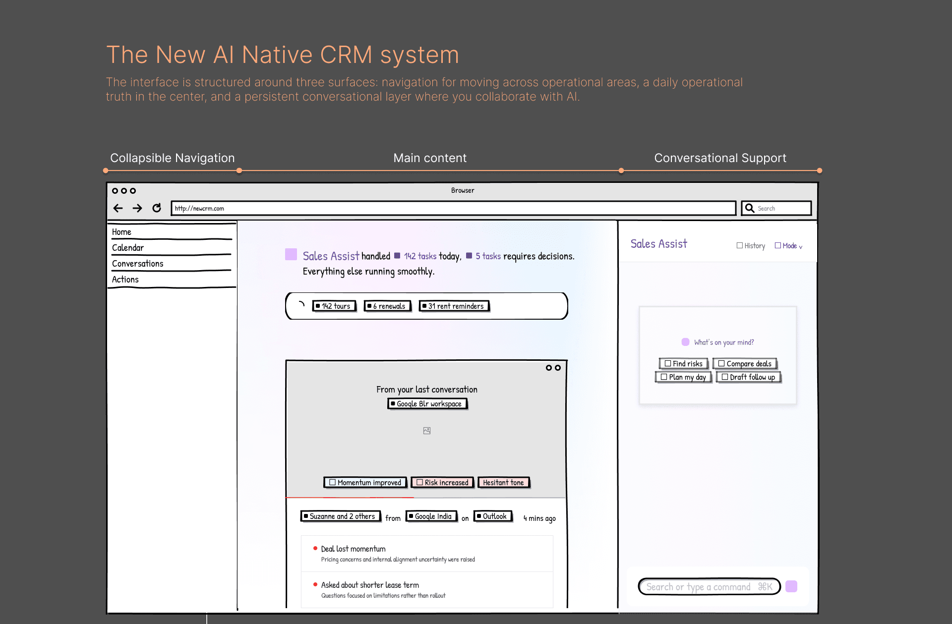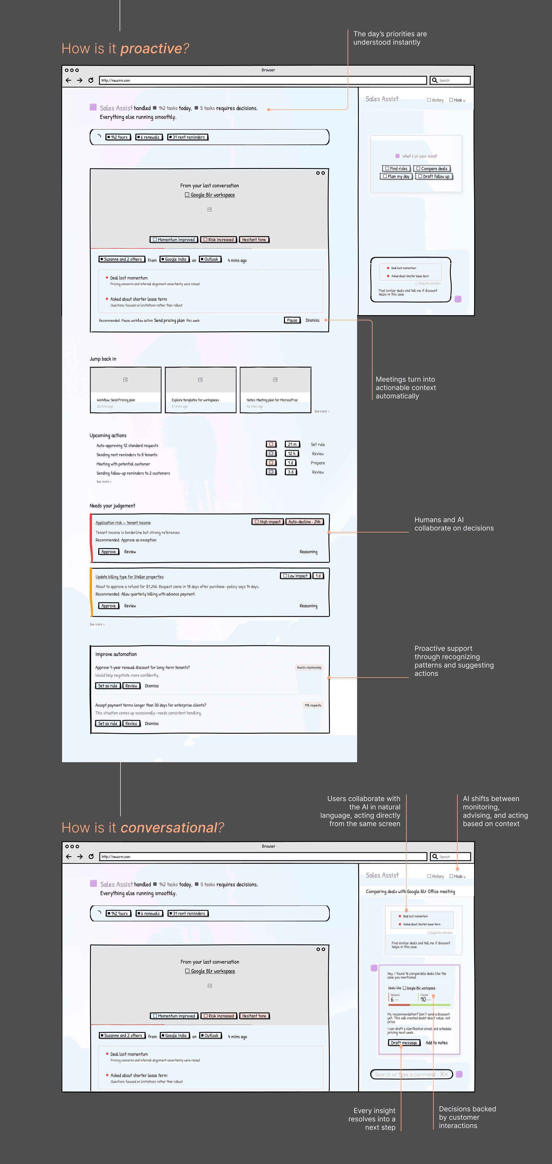 The product is reframed as an operational partner, not a database. An AI assistant watches activity in real time, proactively identifies meaningful moments, and opens a conversational space to investigate context and confirm decisions. Once approved, actions are executed automatically. Instead of managing pipelines, users supervise outcomes while the assistant continuously runs the workflow.