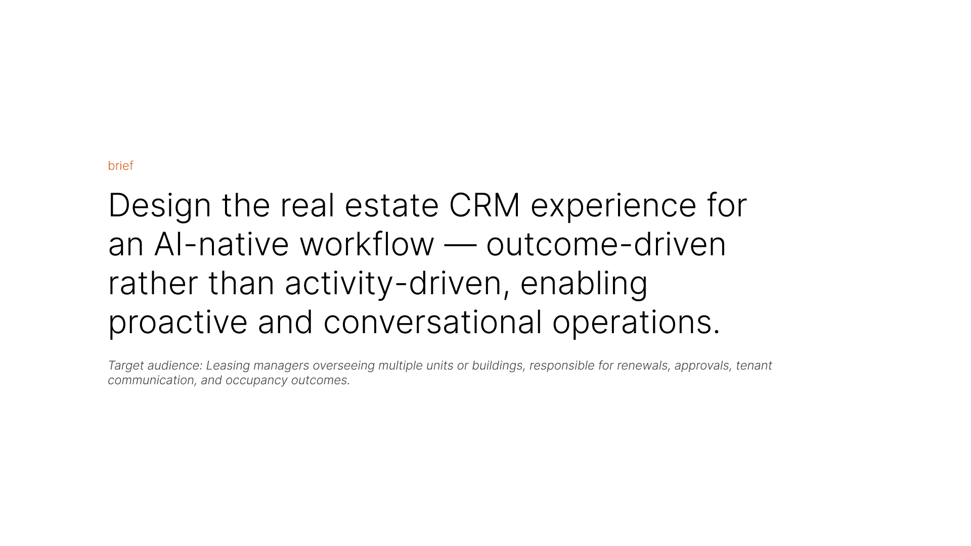 The project aims to define the human control-plane for an AI-native real estate CRM where agents no longer manage pipelines manually, but supervise decisions.