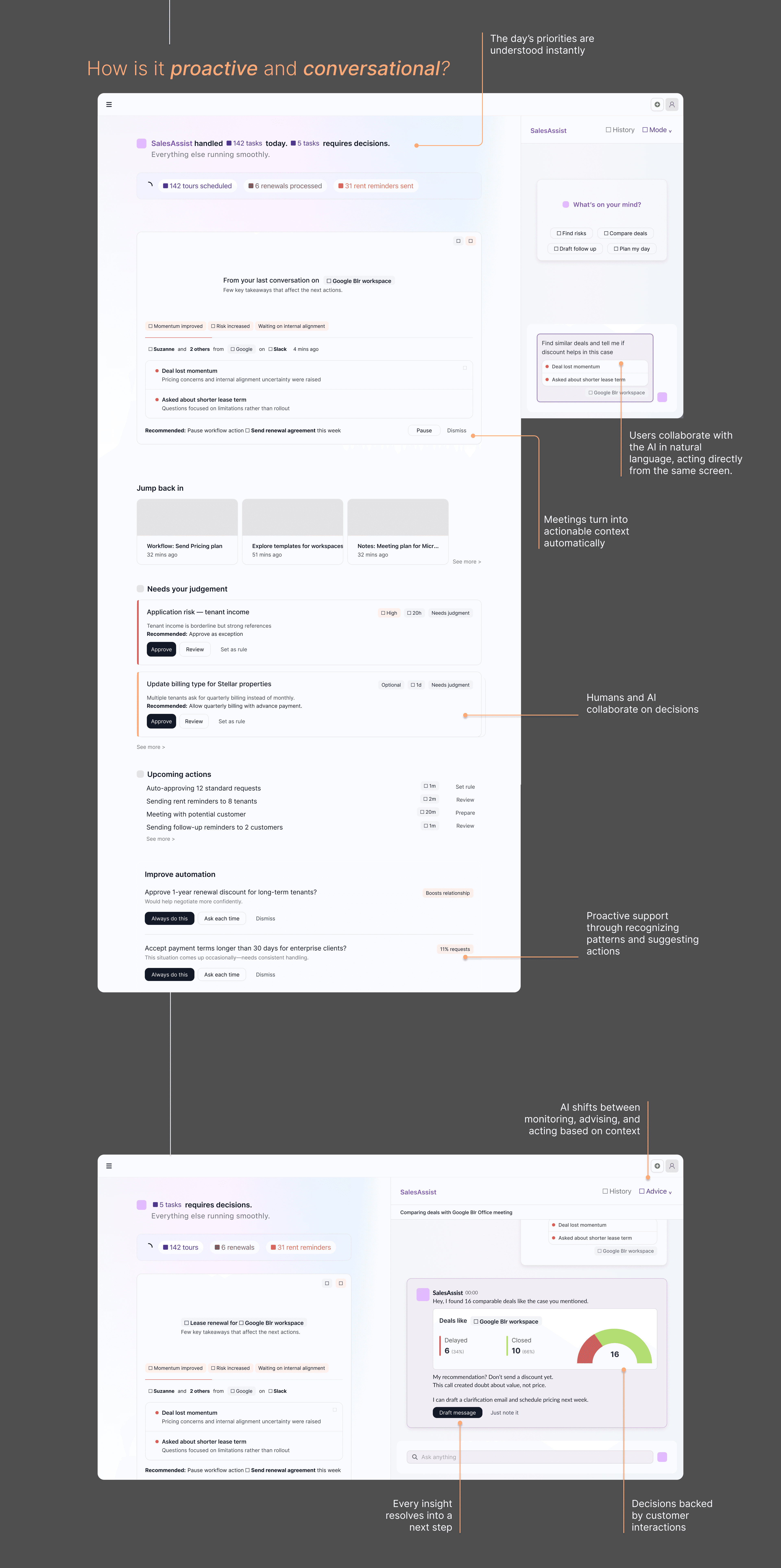 The product reframes the system as an operational partner rather than a database. The assistant watches activity in real time, proactively identifies meaningful moments, and opens a conversational space to investigate context and confirm decisions. Once approved, actions are executed automatically. Instead of managing pipelines, users supervise outcomes while the assistant continuously runs the workflow.