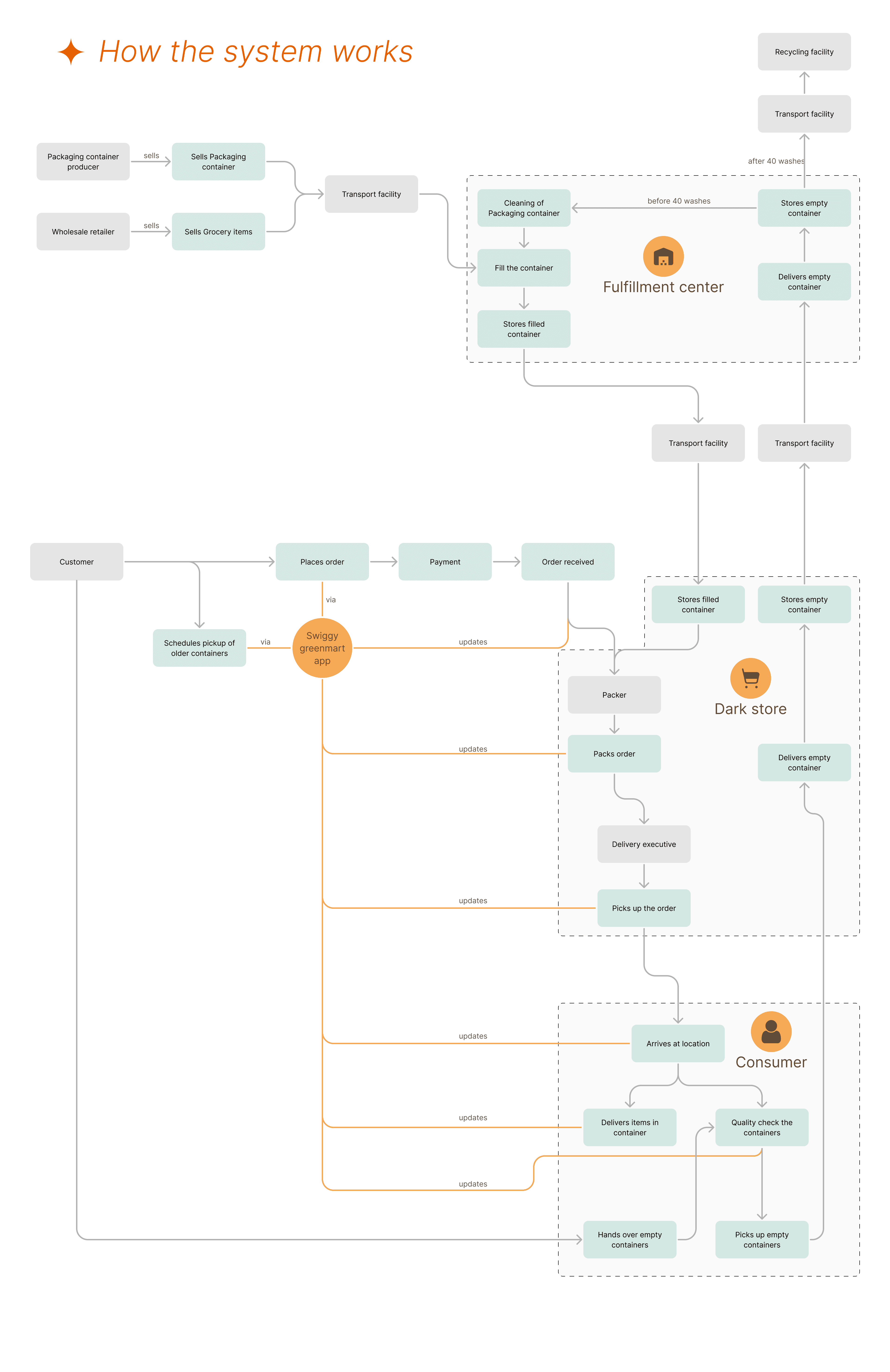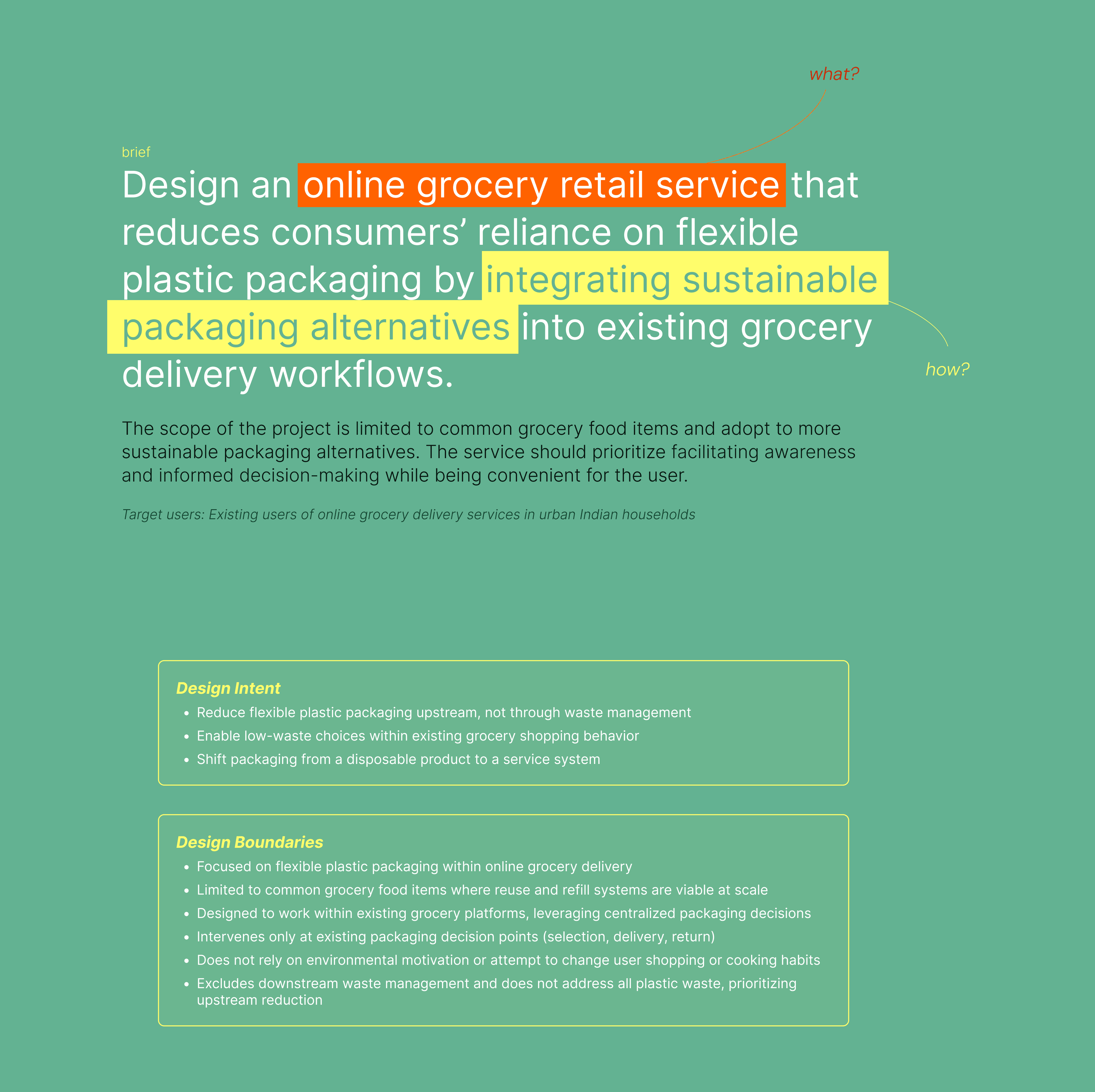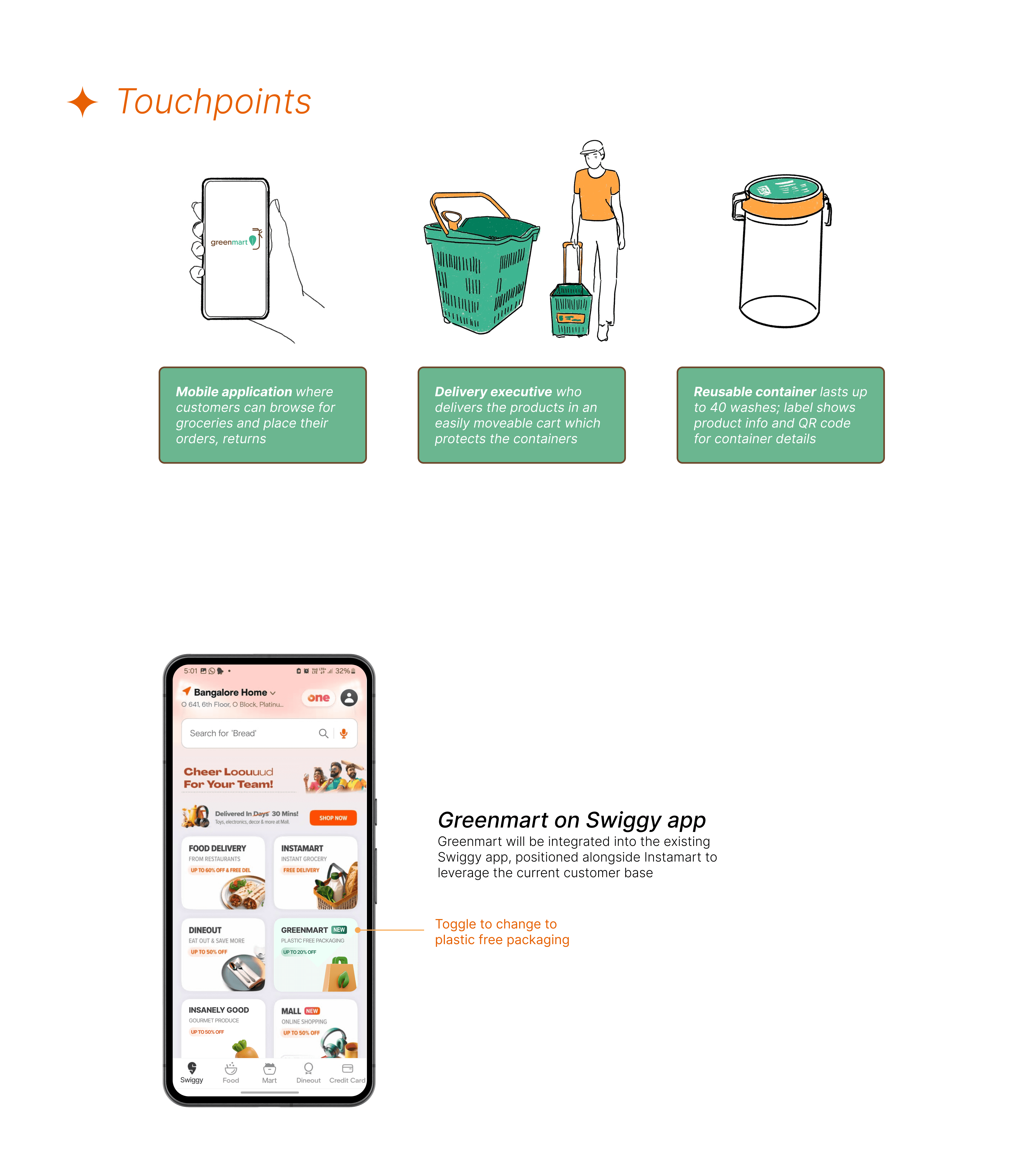 Greenmart is a conceptual service design project situated within India’s rapidly growing online grocery ecosystem. The project explores how upstream innovation — spanning packaging design, logistics, and digital experience — can help large-scale platforms like Swiggy move toward a circular packaging model.